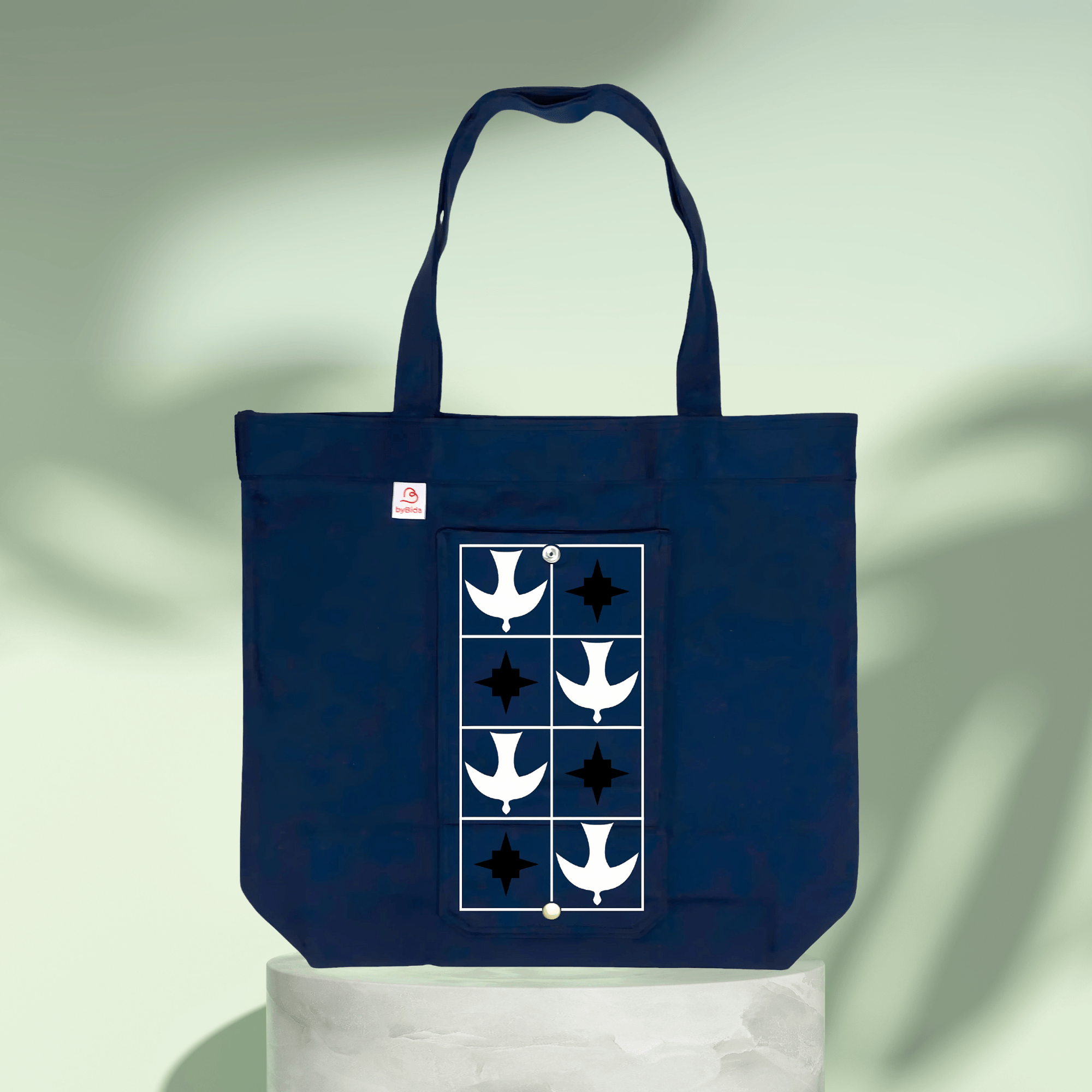 A Ecobag Azulejos da Igrejinha traz em seu bolso externo a estampa do painel de azulejos da Igrejinha Nossa Senhora de Fátima, em Brasília. Esta obra icônica de Athos Bulcão é um símbolo cultural da nossa Capital.